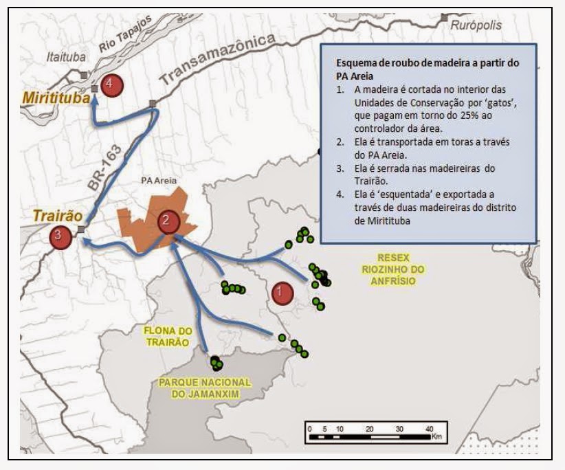 Em 2011, os agricultores João Chupel Primo e Júnior José Guerra denunciaram que quadrilhas chegaram a transportar, em um único dia, cerca de 3.500 metros cúbicos – o equivalente a 140 caminhões carregados de toras e 3, 5 milhões de dólares brutos no destino final -, a maior parte ipê, extraídos das unidades de conservação e transportados por dentro do assentamento.